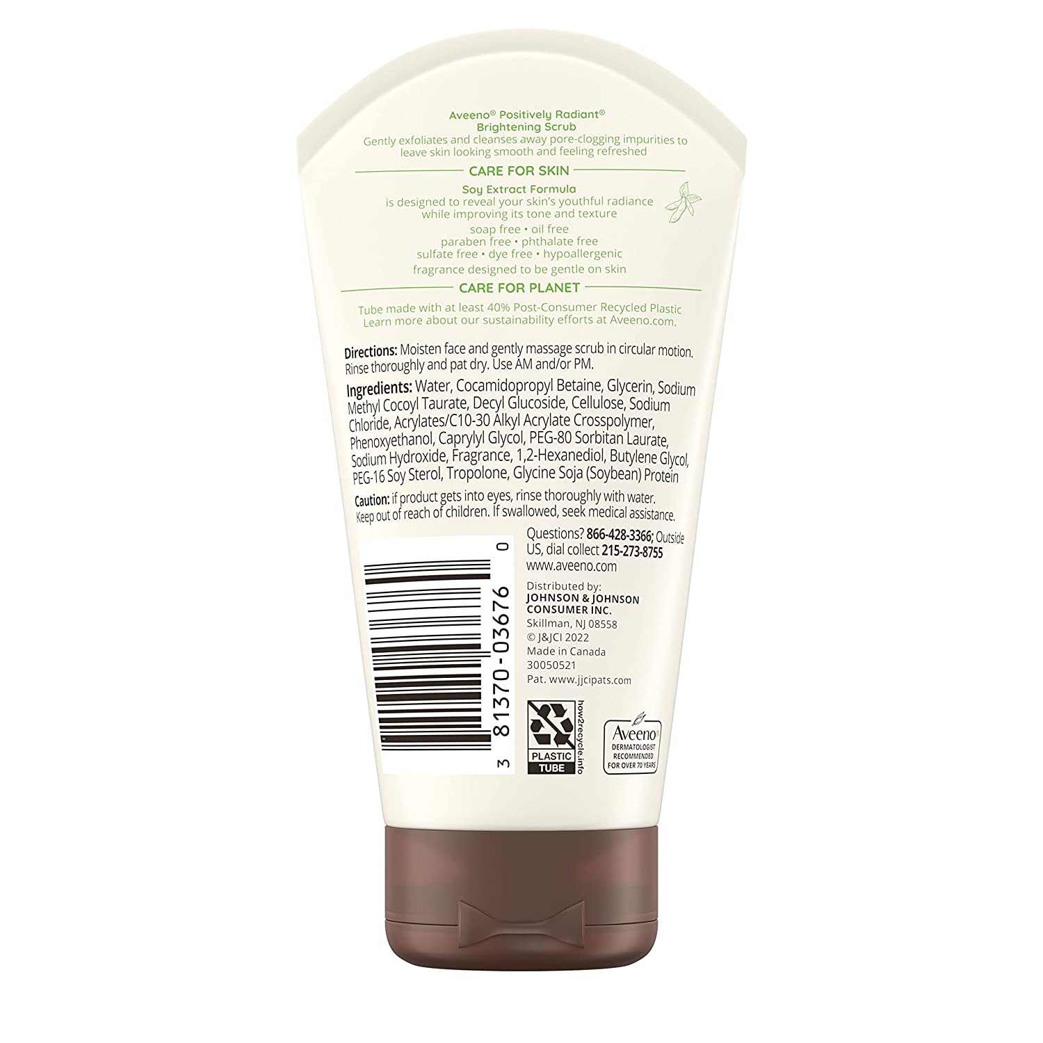 5-ounce tube of Aveeno Positively Radiant Skin Brightening & Exfoliating Daily Face Scrub cleanses & buffs away dead skin, surface impurities, & oil for softer, brighter skin. This scrub helps improve skin's tone & texture & reveals radiant-looking skin