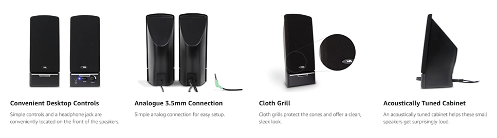 - Ideal for the office or any workspace: Space saving 2.0 PC speakers fit on any tight desktop. Great for any multi-media listening experience, music, games, or voice!