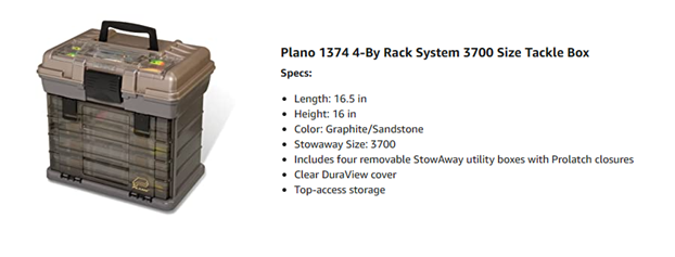 Utilizing Plano's innovative Rack System, the 3700 adds more storage, more versatility, and more value. All of Plano's 3700 series utility boxes are interchangeable for added versatility. The tackle box could also be used to store arts and crafts or nails and hardware. The tackle box includes a nameplate order form for a custom touch. It is covered by a limited lifetime warranty.