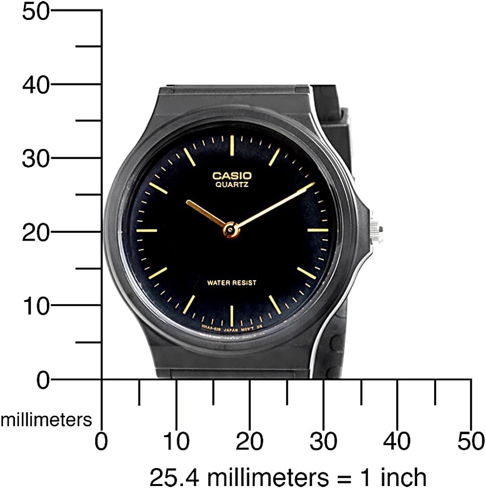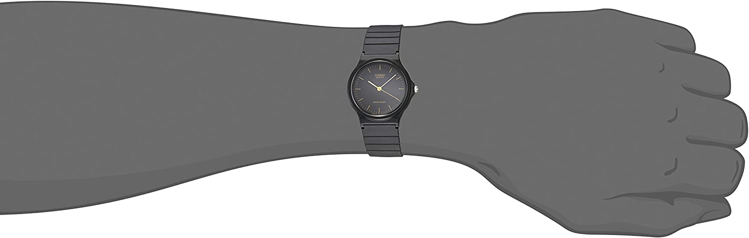 The basic black-and-gold design of the Casio Men's Analog Watch makes it a simple, versatile timepiece great for everyday wear. The watch is constructed with a resin case, a black stationary resin bezel, and a comfortable black rubber bracelet with an adjustable buckle clasp. A durable mineral window protects the black dial face, which cleanly features gold-tone hour indexes, gold-tone minute markers, and complementary watch hands.