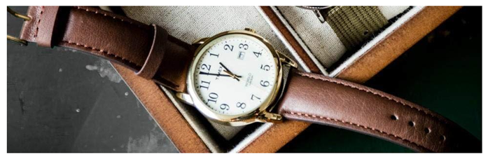 Elegant look Timex model in stainless steel and black leather. The white dial is set with black numeral hour markers and a date function.