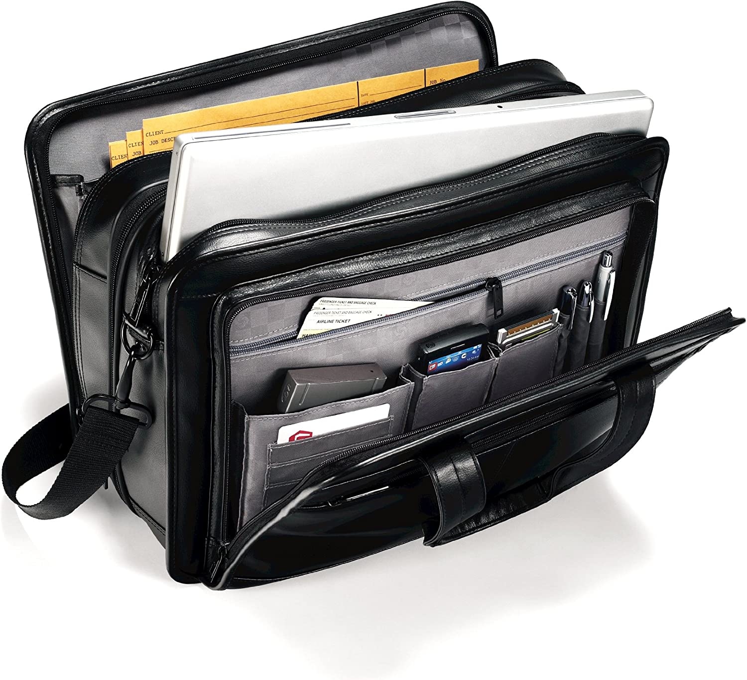 Crafted from genuine Leather, this bag is all business. Comfortable handles that support additional weight from additional files in the expandable compartment. Fits a 15.6 inches laptop computer. SmartPocket slides over upright handles for easy mobility.