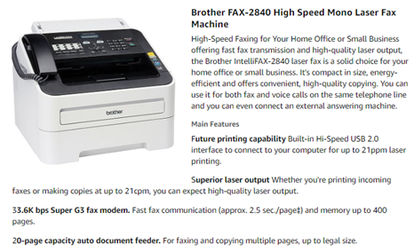 The IntelliFAX-2840 is a laser fax that is ideal for home offices or small offices. It features a 33.6K bps modem, 16MB memory and a 20-page capacity auto document feeder for faxing and copying multiple pages. This compact fax offers up to 272 broadcasting locations, 200 speed dial locations, 22 one-touch keys and can even receive fax and voice calls on the same telephone line. It has a generous paper tray capacity of 250 sheets and a USB interface for future printing capability. Also, an optional high capacity replacement toner cartridge is available to help lower your cost per page.