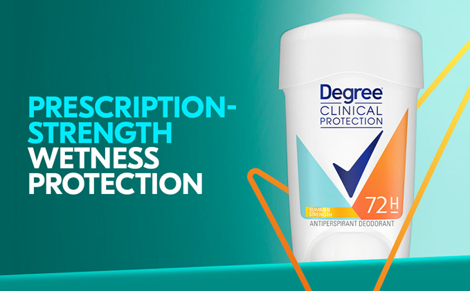 Degree Clinical Protection Summer Strength Antiperspirant Deodorant delivers prescription strength wetness protection, so you can face the day with confidence. This antiperspirant for women features 72 hour sweat and odor protection and the summer scent of green apple and peach, blended with notes of gardenia, jasmine and rose for an invigorating, clean feeling. Only Degree has MotionSense technology that moves in sync with your body. This clinical strength antiperspirant deodorant releases a burst of subtle fragrance every time you move, for nonstop protection. Degree Clinical Protection Summer Strength Antiperspirant Deodorant keeps you feeling fresher, drier, and more confident. This powerful antiperspirant deodorant responds when you need it most so that you don't have to worry about slowing down. Simply swipe and start moving. This antiperspirant deodorant for women with an invigorating scent gives you the confidence to keep moving all day long. Degree Clinical Protection Summer Strength Antiperspirant Deodorant keeps you feeling cool, fresh and protected from sweat and odor. Degree gives you the confidence to keep moving, however you move. At Degree, we want to inspire the confidence in everyone to move more and go further. We’re here to support your journey through an antiperspirant that moves with you and helps you go beyond your limits. As well as increasing our use of reusable materials, we’re making it easier for you to recycle our antiperspirant and dry spray packaging. Degree. It won’t let you down.