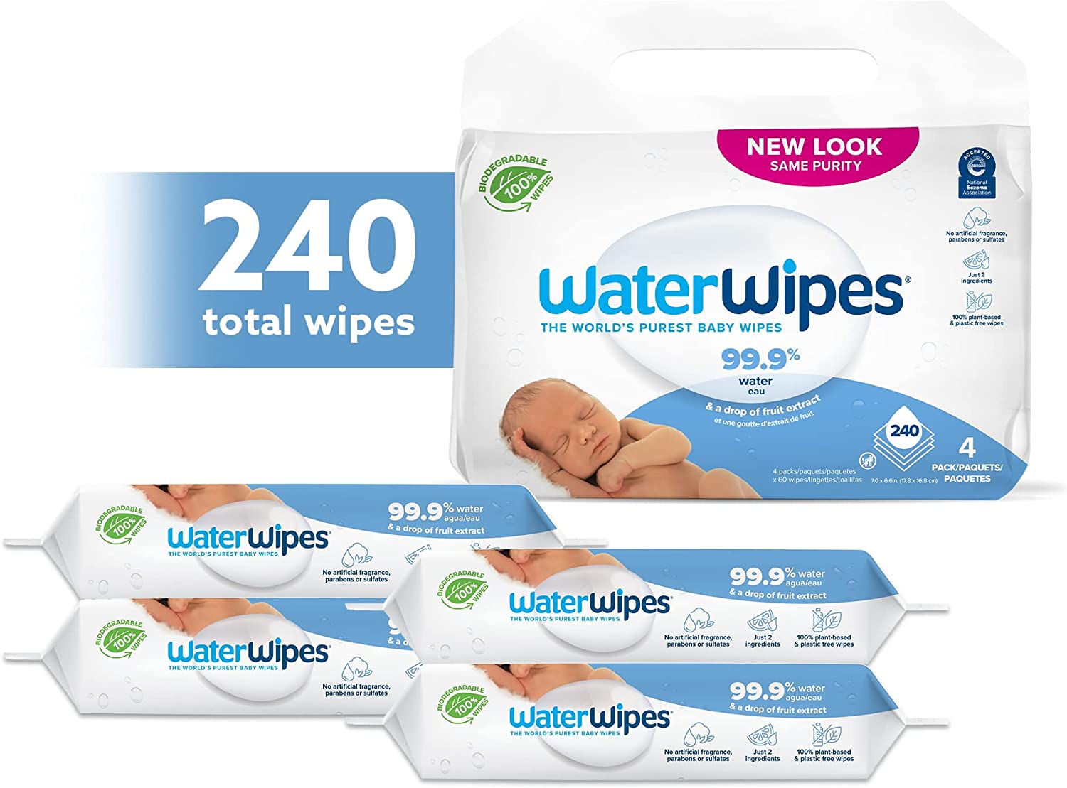 WaterWipes Plastic-Free Original Baby Wipes, 99.9% Water Based Wipes, Unscented & Hypoallergenic for Sensitive Skin, 240 Count (4 packs), Packaging May Vary
