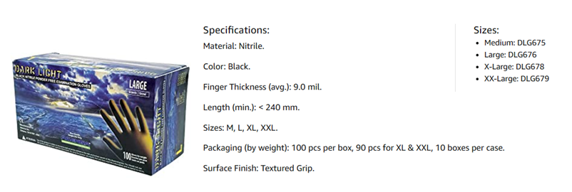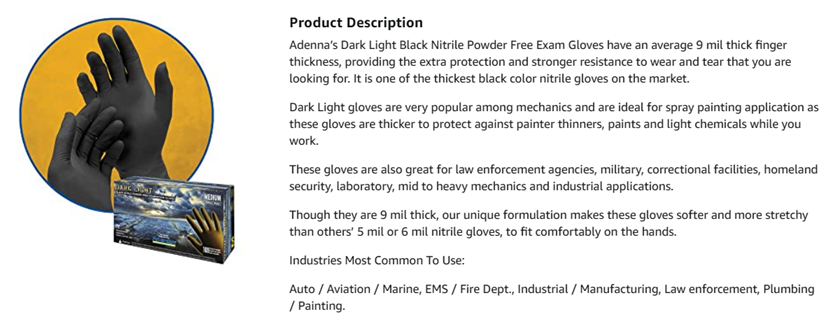 Adenna’s Dark Light Black Nitrile Powder Free Exam Gloves have an average 9 mil thick finger thickness, providing the extra protection and stronger resistance to wear and tear that you are looking for. It is one of the thickest black color nitrile gloves on the market. Dark Light gloves are very popular among mechanics and is ideal for spray painting application as these gloves are thicker to protect against painter thinners, paints and light chemicals while you work. These gloves are also great for law enforcement agencies, military, correctional facilities, homeland security, laboratory, mid to heavy mechanics and industrial applications. Though they are 9 mil thick, yet our unique formulation makes these gloves softer and more stretchy than others’ 5 mil or 6 mil nitrile gloves, to fit comfortably on the hands.
