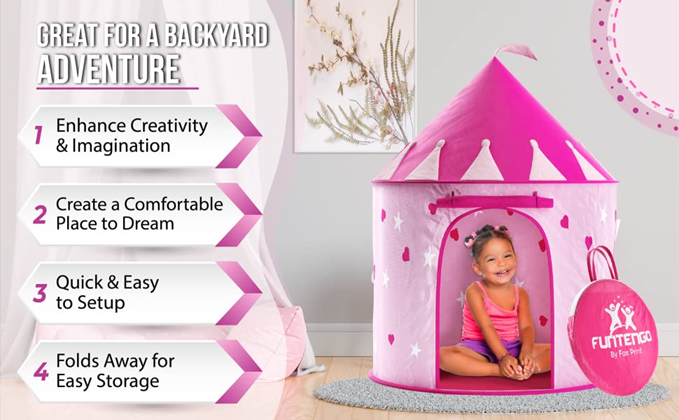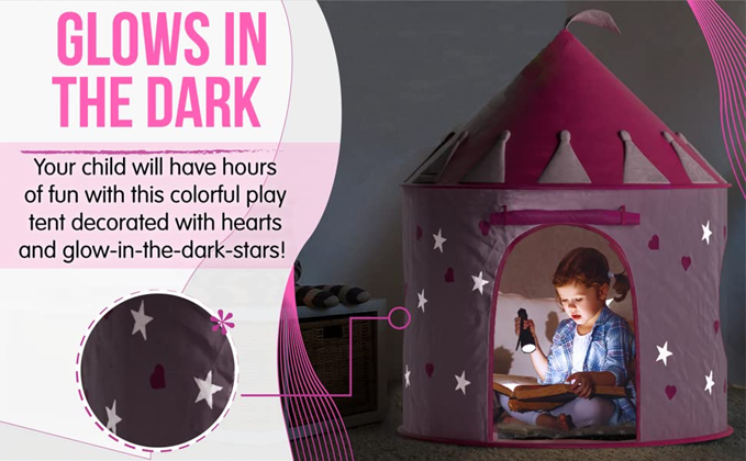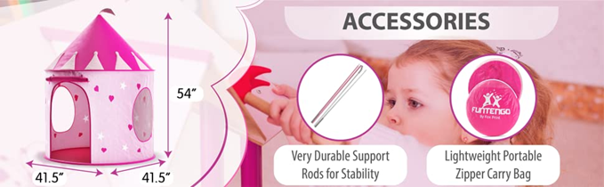 This large princess tent comes with a crawl in entrance with a roll up door. Suitable for ages 3 years +. Dimensions of item: 41.5” x 41.5” x 54” and is made out of 100% polyester taffeta. Features: minimal assembly - pop-up role play tent for instant play folds compactly for easy storage for ages 2 years and over - space for 2-3 kids portable and convenient to carry provides comfortable shelter for outdoor trips colorful and kid-friendly design includes sturdy Shock-Corded – fiberglass poles no assembly or accessories required to fix this tent two side windows for ventilations includes a carrying bag The poles are inserted from the bottom of the tent into concealed sleeves making them hidden and untouchable while in use for maximum safety.