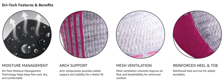 - Moisture wicking fibers keep feet dry with ventilation channels engineered for air circulation and moisture control