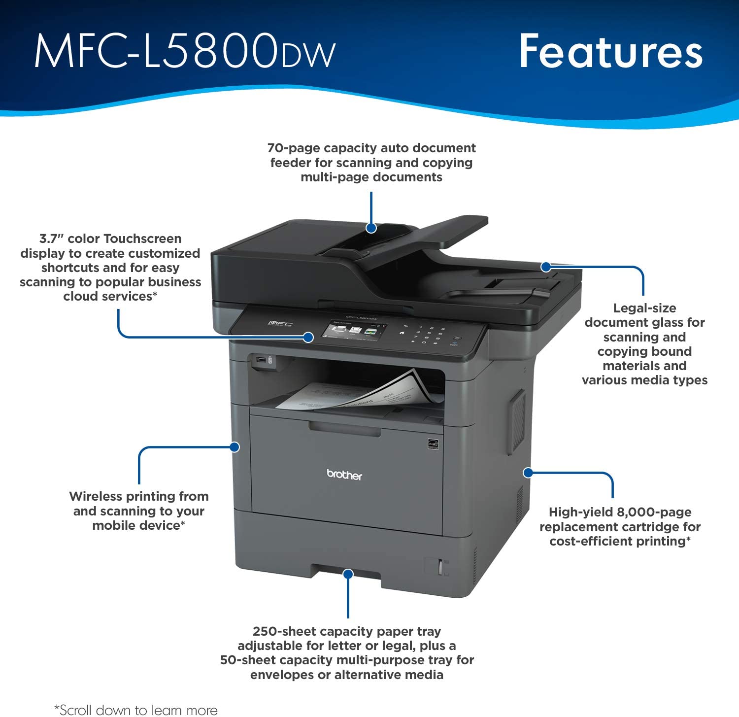 A perfect all-in-one office solution for small to medium-sized businesses, the Brother Business Laser MFC-L5800DW was engineered to help streamline office efficiency. With a print and copy speed of up to 42 pages per minute(2), this high-performance all-in-one produces professional-looking reports, spreadsheets, and other important documents with crystal-clear precision and accuracy. This Brother Business Laser All-in-One is a small office printer, copier, scanner, and fax machine that offers simultaneous operation (meaning that you can scan and print simultaneously). Also, a built-in automatic duplex printing function permits you to print on both sides of the paper, helping save money and resources. The MFCL5800DW multifunction printer offers multiple types of connectivity with Ethernet and wireless interfaces and mobile device printing and scanning support for most smartphones and tablets. (3) The easily navigated 3. 7-inch color touchscreen offers the option of creating up to 48 customized shortcuts for frequently used functions. Users can also scan to or print from popular business cloud services directly from the 3. 7-inch touchscreen display without using a computer via Evernote, Google Drive, Dropbox, and more. (1) This Brother all-in-one offers a 70-page capacity automatic document feeder for copying and scanning multi-page documents. The adjustable 250-sheet capacity paper tray and 50-sheet capacity multipurpose tray make printing and copying simple. This printer can be upgraded to a 1, 340-sheet total capacity with optional trays. The MFC-L5800DW is also Dash Replenishment enabled. This system allows the printer to measure the toner level of your Genuine Brother Replacement Cartridges and automatically order replacements. This ensures you never run out of toner so that you can maintain the office efficiency you expect and require. (1)Requires an Internet connection and an account with desired service. (2)Based on one-sided printing. Change from default setting required. (3)Requires connection to a wireless network. (4)Approximate toner cartridge yield in accordance with ISO/IEC 19752 (letter/A4).