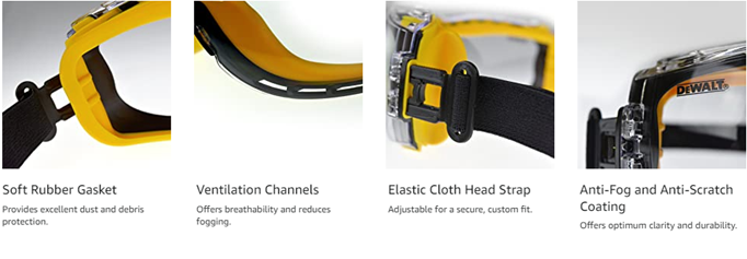 DEWALT ToughCoat hard coated lens , DEWALT XtraClear anti-fog lens coating , Soft, dual injected rubber conforms to the face, Adjustable, elastic cloth head strap provides a comfortable fit, Ventilation channels allow breathability , The DEWALT Concealer goggle is a dual mold goggle that provides protection from dust and debris