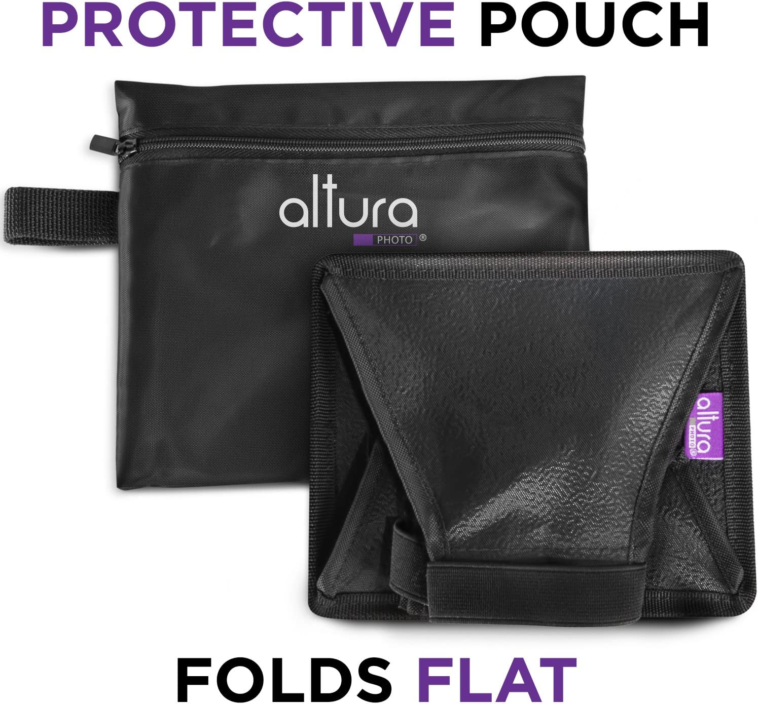 SIMPLE AND COMPACT: Integrated hook and loop fastener strap secures around the flash head. Folds down flat when not in use.