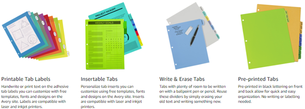 These Big Tab Write & Erase Durable Plastic Dividers let you write, erase and reuse your 3 ring binder dividers for easy changes at any time. Simply write directly on the stylishly shaped tabs with a ballpoint pen or pencil, and erase as needed. You can also take quick notes on the 8.5” x 11” plastic divider body and easily erase later. Made from ultra-durable, tear-resistant plastic, these dividers can be wiped clean with most non-abrasive household cleaners and are ideal for frequent use in any 3 ring binder. The Big Tab design offers 1.5 times more writing space than standard binder dividers with tabs, and the multiple bright colors allow for quick referencing. Ideal for your personal organization at home, work and school. This item comes with a set of 8-tab dividers for a total of 8 multicolor dividers.