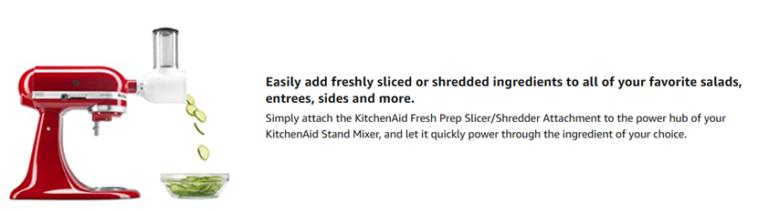 Easily add freshly sliced or shredded ingredients to all of your favorite salads, entrees, sides and more. Simply attach the KitchenAid(R) Fresh Prep Slicer/Shredder Attachment to the power hub of your KitchenAid(R) Stand Mixer, and let it quickly power through the ingredient of your choice.