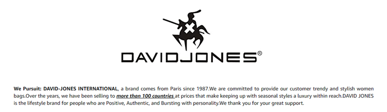 DAVIDJONES:a brand comes from Paris since 1987.Selling Handbags for Women and Girls in More than 100 countries.Great stylish and Convertible Womens Purses.Excellent craftsmanship and refined premium quality leather like PU bags.Decent high end women handbags with affordable price.