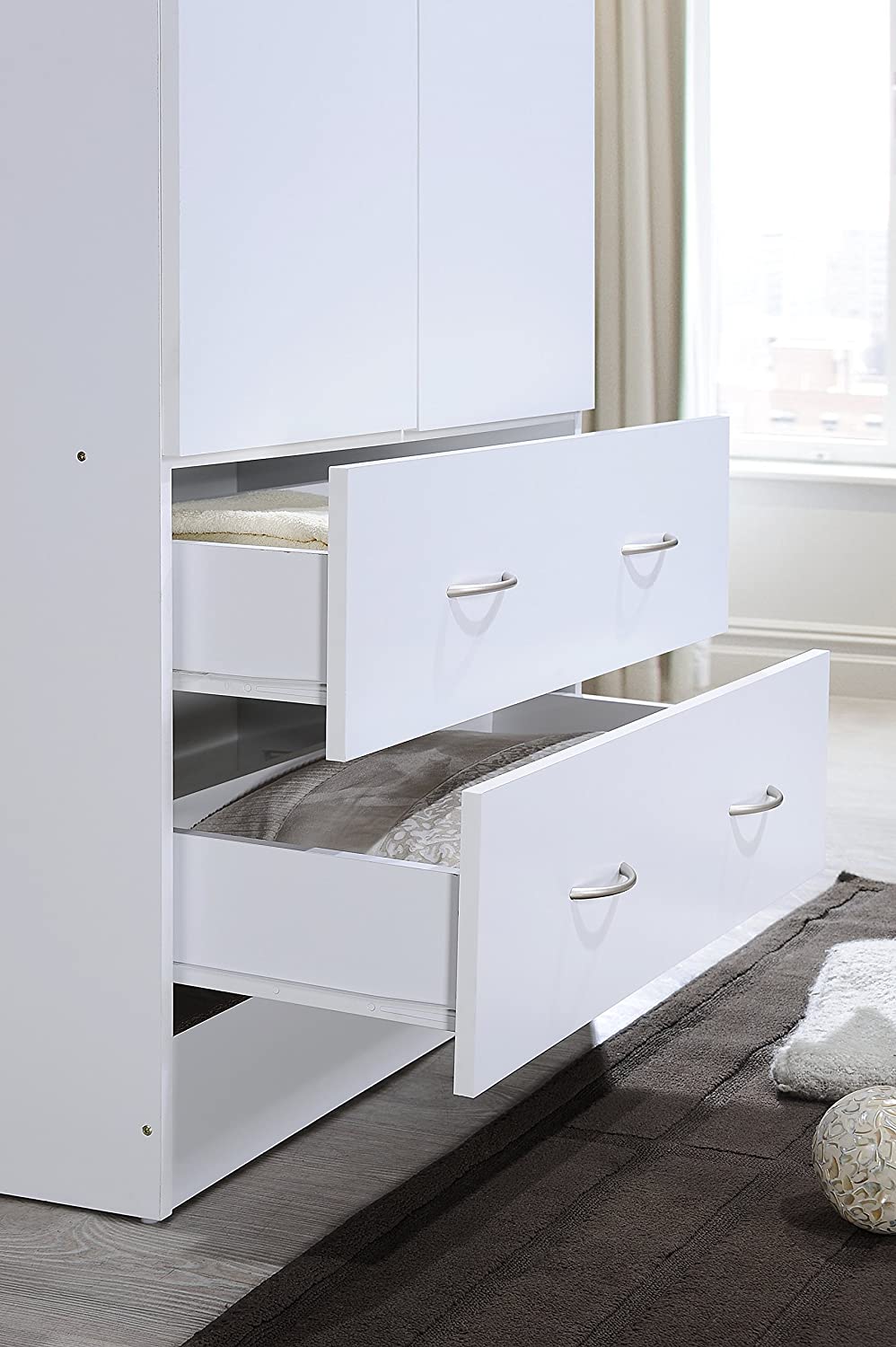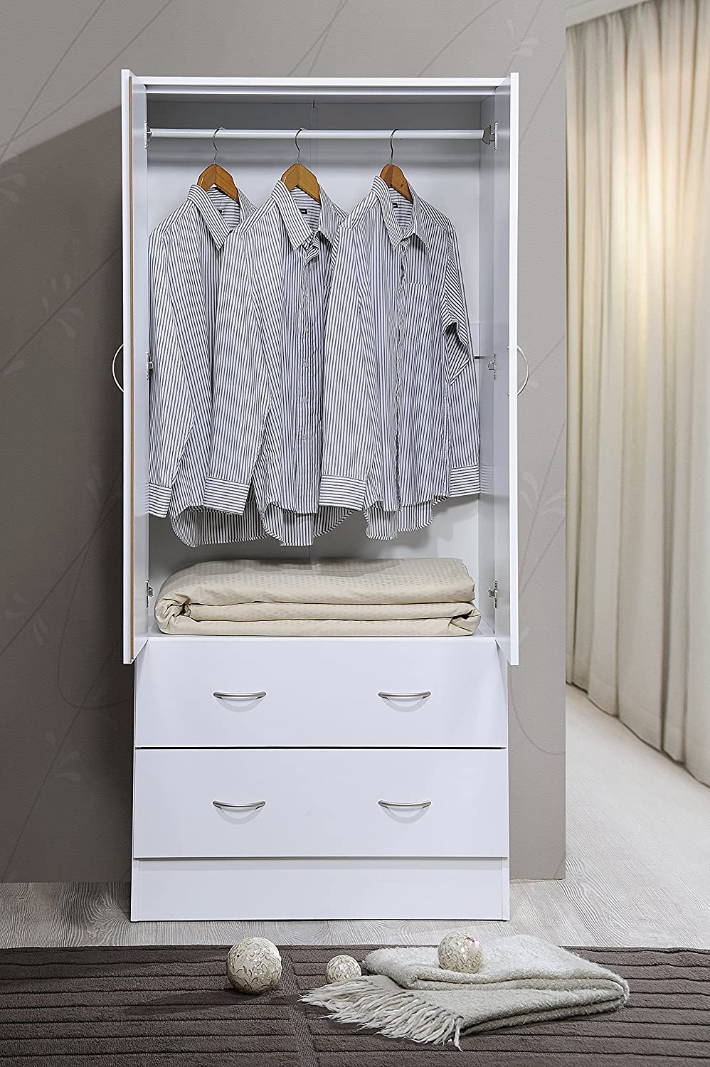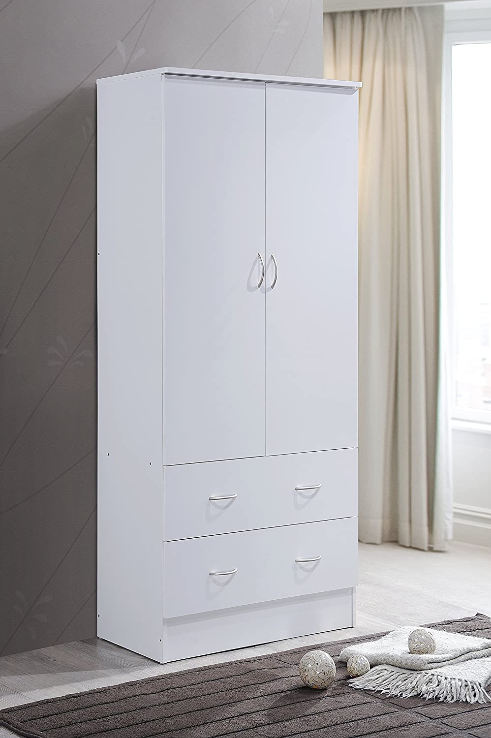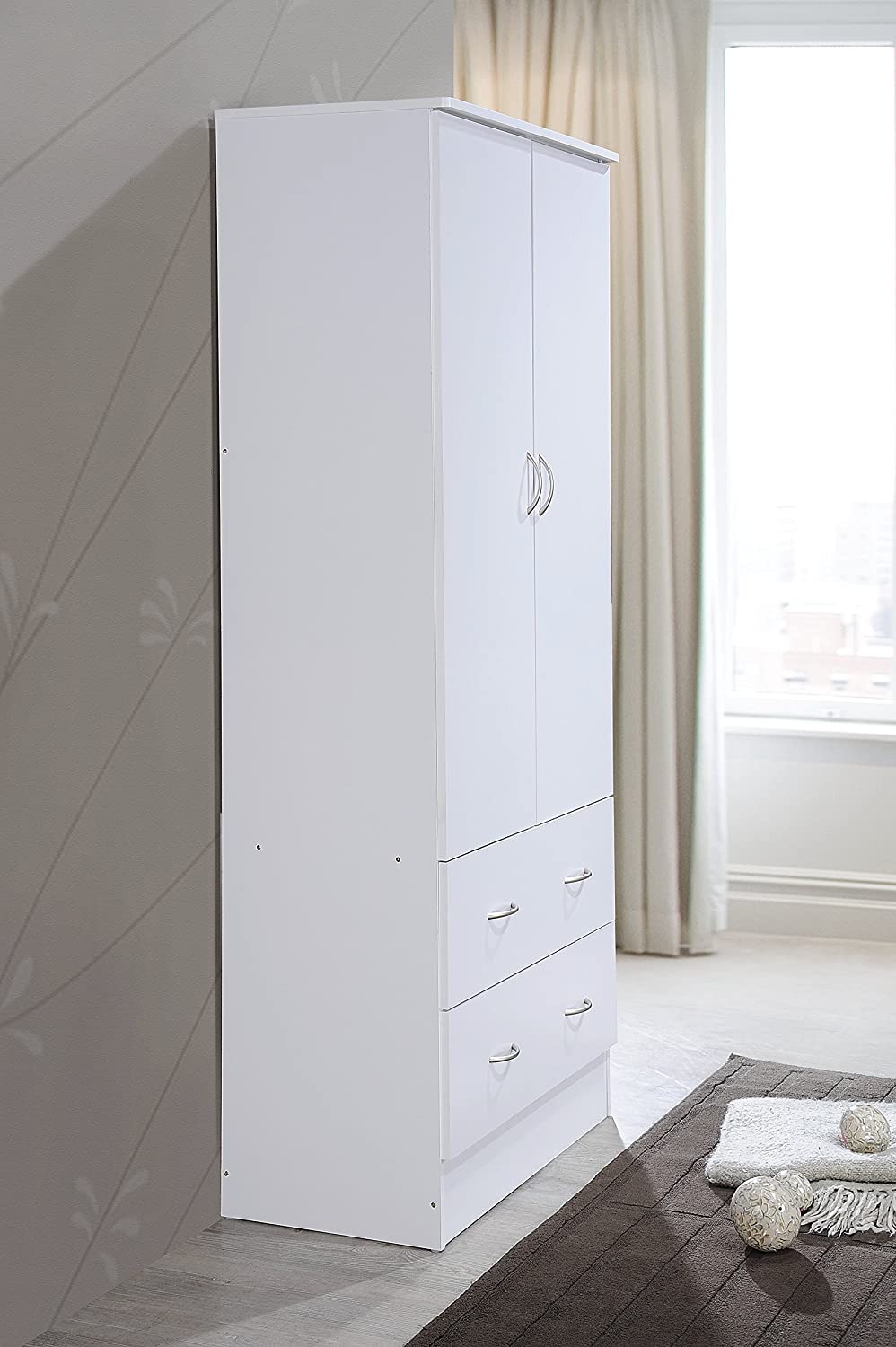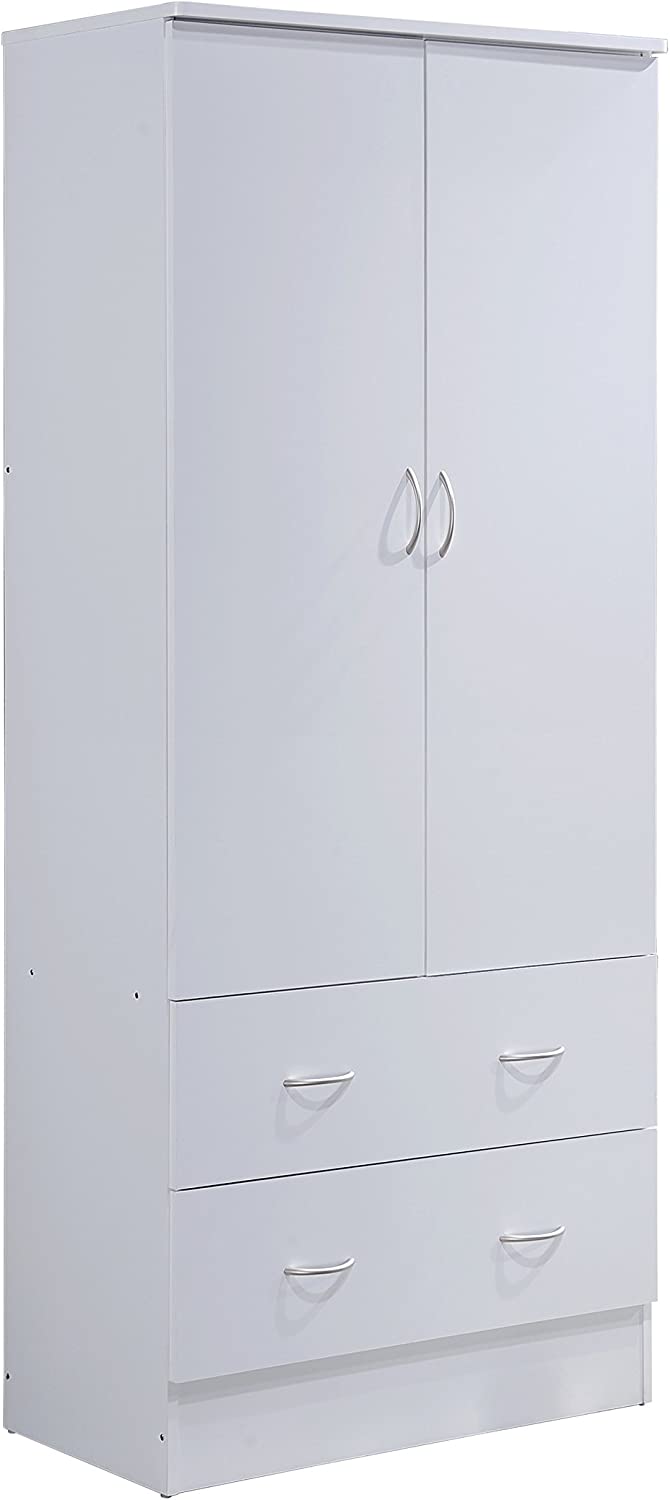 HODEDAH IMPORT Two Door Wardrobe, with Two Drawers, and Hanging Rod, White.