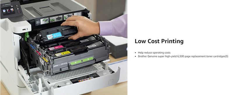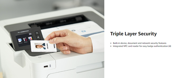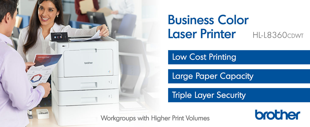 For businesses that require a dependable and cost-efficient color laser printer with a large paper capacity, the Brother HL-L8360CDWT is the solution. Arriving with dual paper trays, (250- and 500-sheet capacities), this business color laser printer produces both black and color pages at print speeds up to 33 pages per minute. (1) An additional 50-sheet capacity multi-purpose tray for printing envelopes and additional media increases the total capacity to 800 pages. The built-in automatic duplex printing feature reduces your printing costs while producing professional-looking two-sided documents, brochures, presentations, and booklets. Connecting to the Brother HL-L8360CDWT is simple and convenient. Built in wireless and Gigabit Ethernet interfaces allows users to share the printer with others on their network. Users can also easily print from their mobile devices. (2) An adjustable 2. 7″ Touchscreen display offers easy menu navigation and printing from Google Drive, Dropbox, OneDrive, and more. (5) This printer also has advanced security features, an NFC card-reader allows for easy badge authentication, and Active Directory support, which allows for network user authentication. The Brother HL-L8360CDWT color office laser printer is also Dash Replenishment–enabled. When you activate this feature, Dash Replenishment will continuously measure the toner level and order more from when it’s low. This unique Brother feature keeps busy office workspaces operating at peak efficiency, ensuring you don’t run out of toner. (1)Based on one-sided printing. Change from default setting required. (2)Requires connection to a wireless network. (3)Approximate cartridge yield in accordance with ISO/IEC 19798 (letter/A4). (4)The mobile device must have NFC capability and run Android OS 4. 4 or later. (5)Requires an Internet connection and an account with desired service.