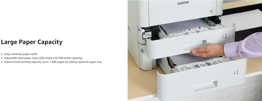 • LARGE PAPER CAPACITY, EXPANDABLE: Dual paper trays (250-sheet and 500-sheet capacity) that allow busy workgroups to print with fewer interventions