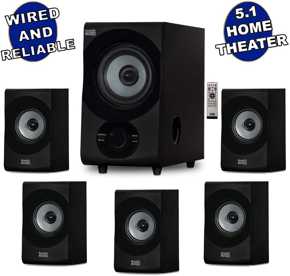 Acoustic Audio by Goldwood AA5172 Bluetooth 5.1 Speaker System Stream music from your phone to the built in Bluetooth Receiver Integrated Power Amplifier with 700 Watts System Power Pro Surround Function Automatically Converts Stereo to 5.1 Sound Easy Plug and Play Connections. Standard RCA inputs connect to most audio sources 6 Independent RCA Inputs for True Surround Stereo RCA AUX Inputs Illuminated Display with Front Panel Controls USB Drive Input and SD Card Input FM Tuner Full Function Remote Magnetically Shielded Wired Satellite Speakers 1 Powered Subwoofer Speaker is (H x W x D) 12.3" x 6.7" x 13.1". Frequency Response is 20Hz-20 kHz Enhanced Bass Boost Ported Design 5 Wired Satellite Speakers are (H x W x D) 6.7" x 4.1" x 4" each 2 Front and 1 Center Satellite Speakers have 6 Foot Single RCA Cables 2 Rear Speakers have 12 Foot Single RCA Cables System Requirements Standard US 110V Grounded Wall Plug Any audio device with a standard 3.5mm Headphone, RCA Stereo or RCA 6 Channel Surround Audio Outputs Search AA5170D for this model with Smart TV Digital Optical Input Applications TV or Home Entertainment System Laptop or Personal Computer DVD or MP3 Player Cell Phone or Tablet Gaming What's in the box 1 Powered Subwoofer Speaker 5 Passive Wired Satellite Speakers Full Function Remote RCA Antenna Cable 3.5mm to RCA Cable RCA to RCA Jack Cable Instruction Manual