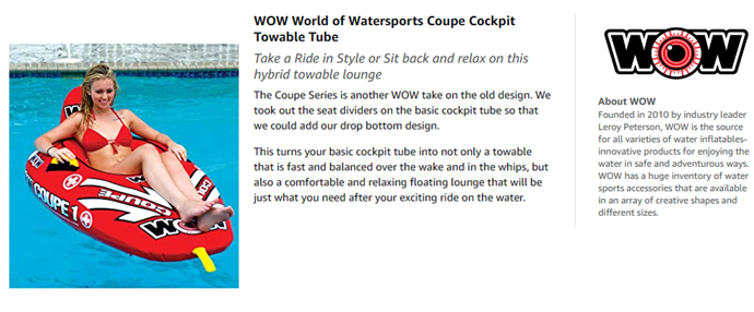 | Model Name | WoW World of Watersports 15-1030 Coupe Cockpit Towable, Inflatable, 1 or 2 Person |