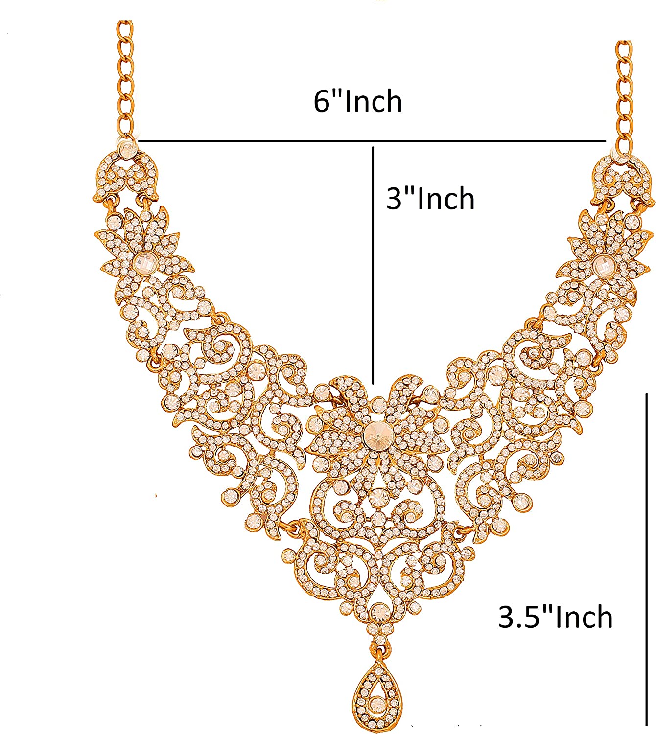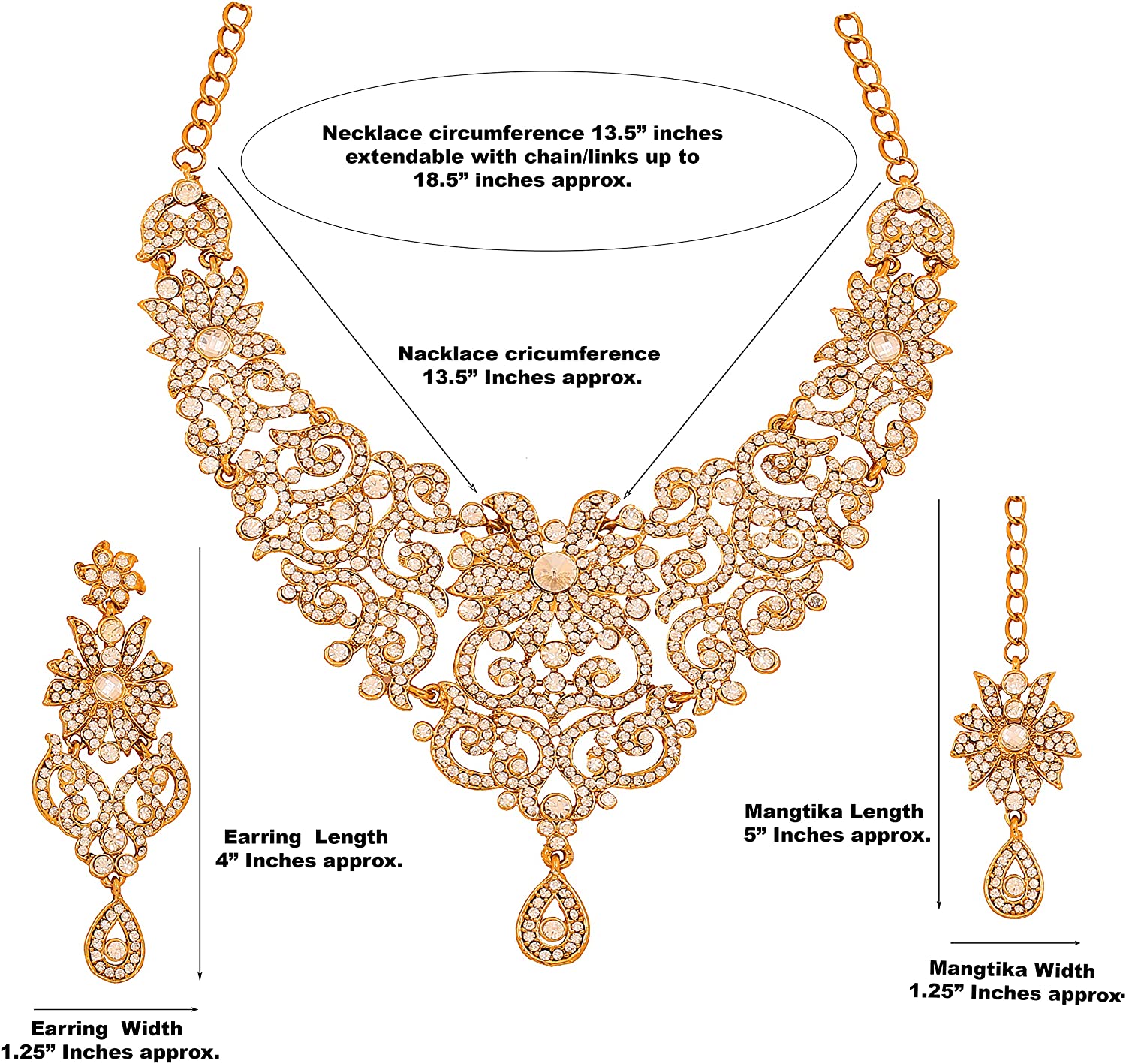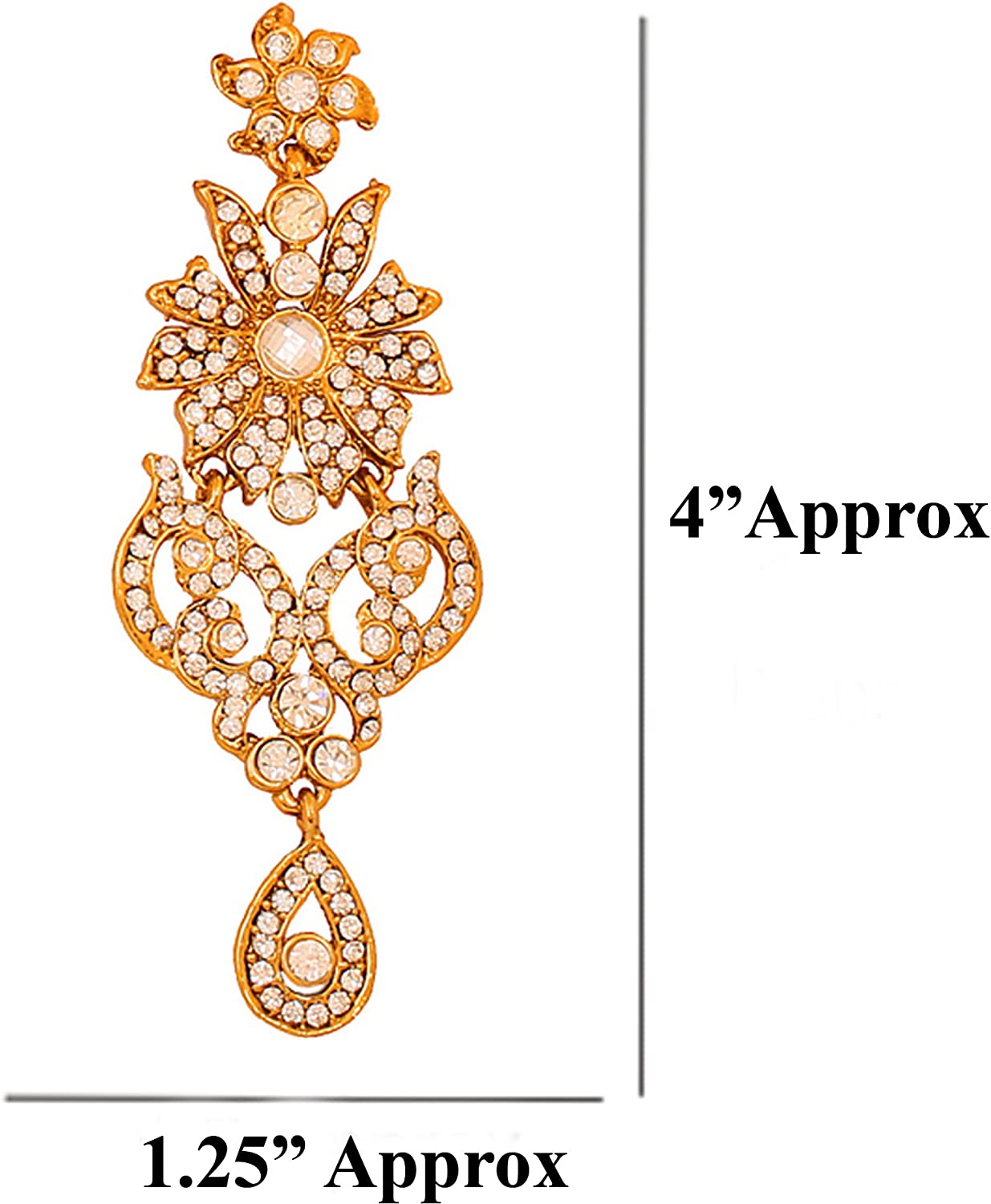 • Touchstone Indian Bollywood traditional royal look attractive filigree carving white Rhinestone grand bridal designer jewelry necklace set for women in antique gold tone EXTRA LONG EARRINGS. Length 4 inches SPECIFICATIONS : Necklace circumference 8 inches with adjustable/extendable soft tassel. Earring weight (single) 18 gms. Earring length 4 inches. Earring width 1.25 inches. This is in a special dark gold plating to recreate the look of antique jewelry.