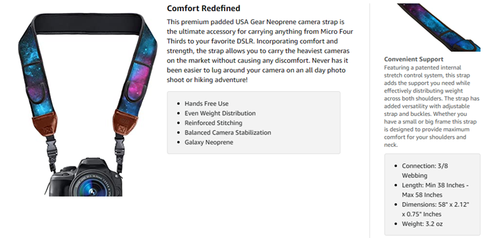 • NON-SLIP SURFACE DESIGN holds securely around neck & shoulders so you're always ready to snap your next photo | DURABLE REINFORCED STITCHING stays intact and ensures you can hold cameras of all sizes