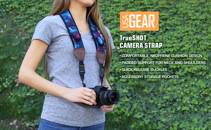 USA GEAR TrueSHOTNeck Strap Neoprene Camera Straps - Padded Camera Strap, Accessory Pocket, and Quick Release Buckles - Compatible with Canon, Nikon, Sony and More DSLR and Mirrorless Camera - Galaxy