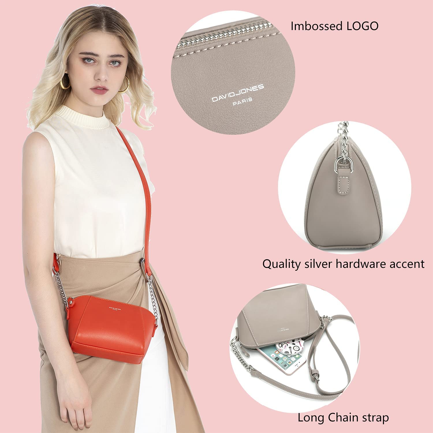 CONSTRUCTION:Zipper closure for the main compartment;1 internal ZIP pocket;1 internal slip pockets for small essentials;Adjustable Long Strap with chains decorated.Elegant imbossed LOGO NO stratching your dressing. DAVIDJONES woven dust bag for free.