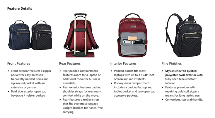 • 【Fashion Forward Quality】Made of a stylish chevron quilted polyester-twill water-resistant exterior with gold-plated zippers. Interior features a fully lined tear-resistant stripe polyester lining that will stand up to daily use. The perfect 15-inch computer backpack to keep your business essentials organized while on the go.