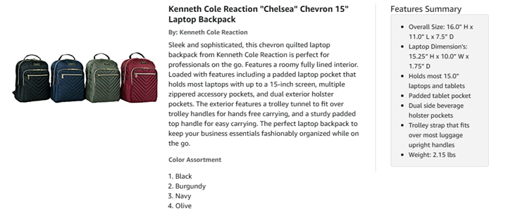 Sleek and sophisticated, this chevron quilted laptop backpack from Kenneth Cole Reaction is perfect for professionals on the go. Features a roomy fully lined interior with multiple interior pockets for all your needed essentials. Loaded with features, including a separate padded laptop compartment that holds most laptops with up to a 15-inch screen, a padded tablet pocket in the main compartment, multiple zippered accessory pockets, and dual exterior beverage holster pockets. The exterior features a trolley tunnel to fit over luggage trolley handles for hands free carrying, and a sturdy padded top handle for easy carrying. The perfect fashion-forward laptop backpack to keep your business essentials fashionably organized while on the go. ★ Overall size: 16” H x 11” W x 7.5” D. ★ Computer Compartment Size: 15.25” H x 10” W X 1.75” D. ★ Product Weight: 2.15 lbs. ★