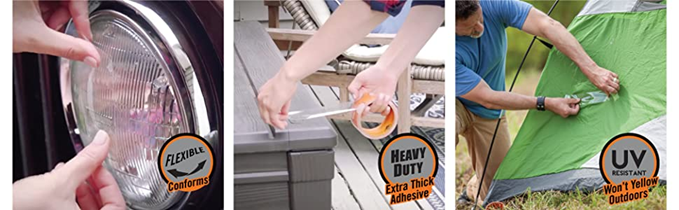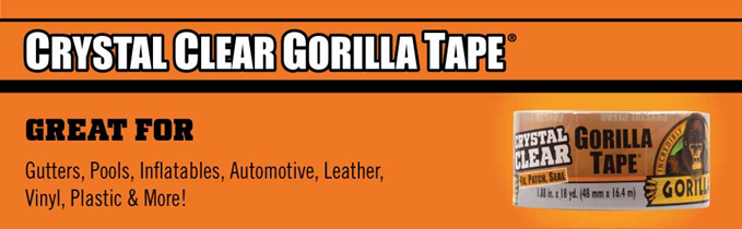 Crystal Clear Transparent Gorilla Duct Tape features the strength of Gorilla Tape, in a crystal clear tape that does not yellow outdoors. Made with a heavy duty adhesive layer and waterproof backing for extreme durability. This tape is UV and temperature resistant - great for projects and repairs both indoors and out. Crystal Clear Gorilla Duct Tape is best if used between 10°F and 120°F. To prevent fingerprints, clean your hands prior to using the tape and handle the tape only at edge. Use a straight edge (credit card or similar object), to press out fingerprints. For best results, apply the tape to a clean surface. Airtight patches are best achieved on smooth, dry surfaces with the tape on both sides of the repair (when accessible). Tape size should be larger than the repair area, extending beyond all edges. Rub the entire surface of the tape aggressively, especially the edges. NOTE: Surface patch will gain additional strength with time. Crystal Clear Gorilla Duct Tape works best for patching with a single layer. Not for patching inflatables at seams. Click on the Gorilla link at the top of this page to see other quality products from the Gorilla Glue Company.