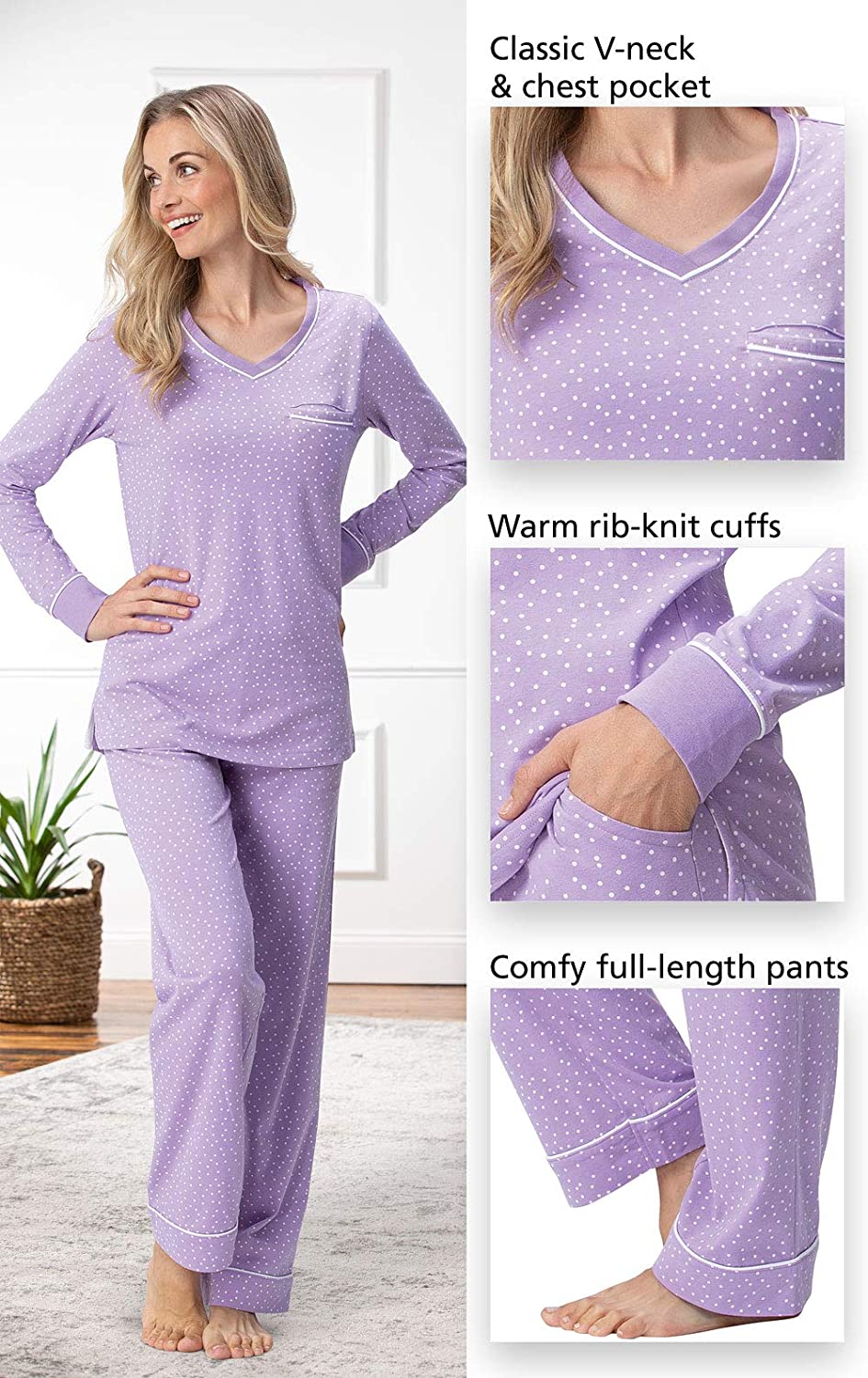 Two-Piece Pullover PJ Set - Women's cotton pajama set features a long-sleeve v-neck shirt with rounded hem and chest pocket; matching long pajama pants with an elastic drawstring waist; pj set for women is available in our classic polka dots or rich solids, with contrast trim.
