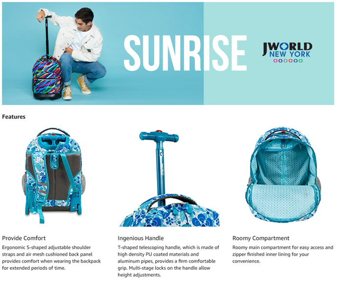 This rolling backpack for women and men converts from a rolling back on wheels into a wearable backpack with shoulder straps. Features a large main compartment, 2 mesh side pockets and a front pocket organizer. Measuring 18 x 13 x 9 inches, this backpack is also designed to be used as an underseat carry on bag for airplane travel. The single-tube aluminum handle extends to 34 or 39 inches for easy maneuverability by kids and adults up to 6’ 3” tall. Telescoping handle stores nested in bag. Molded rubber bottom holds up to the punishment of dragging on pavement. No more holes in the bottom of your kids rolling backpack! Made of durable ripstop polyester fabric with a metal frame and reinforced edges, this rolling backpack for boys and girls has a water resistant coating to keep your gear dry. Reflective tape gives night visibility. Features cushioned air mesh shoulder straps and back pad, or use the padded handle to carry this rolly backpack for girls and boys. This bag with wheels for kids and adults quickly converts into a wearable backpack when going up stairs or over rough ground, just pull out backpack straps. To convert back to a rolling travel backpack, simply tuck the straps away in the back pocket—no having to unzip. Large rubber backpack wheels roll and turn effortlessly on sidewalks, paths and airplane aisles. Corner mounted wheels provide extra stability. Our Promise - at J World New York, we stand behind our products 100%. If you have any issues with this rolling backpack for girls and boys, we will make things right