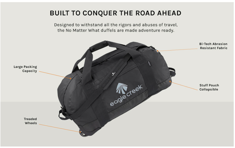 • PEACE OF MIND when you travel with Eagle Creek’s No Matter What lifetime warranty