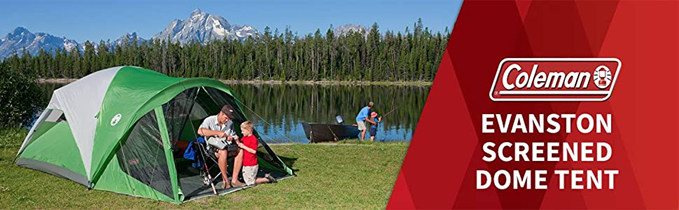 Enjoy the great outdoors without the bugs inside the Coleman Evanston 8-Person Tent with Screen Room. Great for car camping and extended camping trips, this spacious tent offers enough room for 2 queen-size airbeds and is designed to set up in under 15 minutes thanks to snag-free, continuous pole sleeves and Insta-Clip pole attachments. The tent’s WeatherTec system features patented welded floors and inverted seams to keep the rain off you and your gear; a rainfly is included for extra weather protection. Extended awnings let you keep the windows open for enhanced air circulation without letting in the rain. The tent also comes with a separate screened-in room for extra ventilation, covered storage for your gear, or an extra sleeping area on warmer, dry nights. Remove the included rainfly to let in more sunlight through the mesh roof on dry days or to gaze up at the stars on dry nights. "Enjoy a serene sunset in the great outdoors without the mosquitoes. In addition to all the features that make it a great choice for car camping, the Coleman 8-Person Evanston Dome Camping Tent includes a separate full-floor screen room for bug-free lounging, covered storage, or extra sleeping space on warmer nights. In addition to all the features that make it a great choice for car camping, the Coleman 6-Person Evanston Dome Camping Tent includes a separate full-floor screen room for bug-free lounging, covered storage, or extra sleeping space on warmer nights.