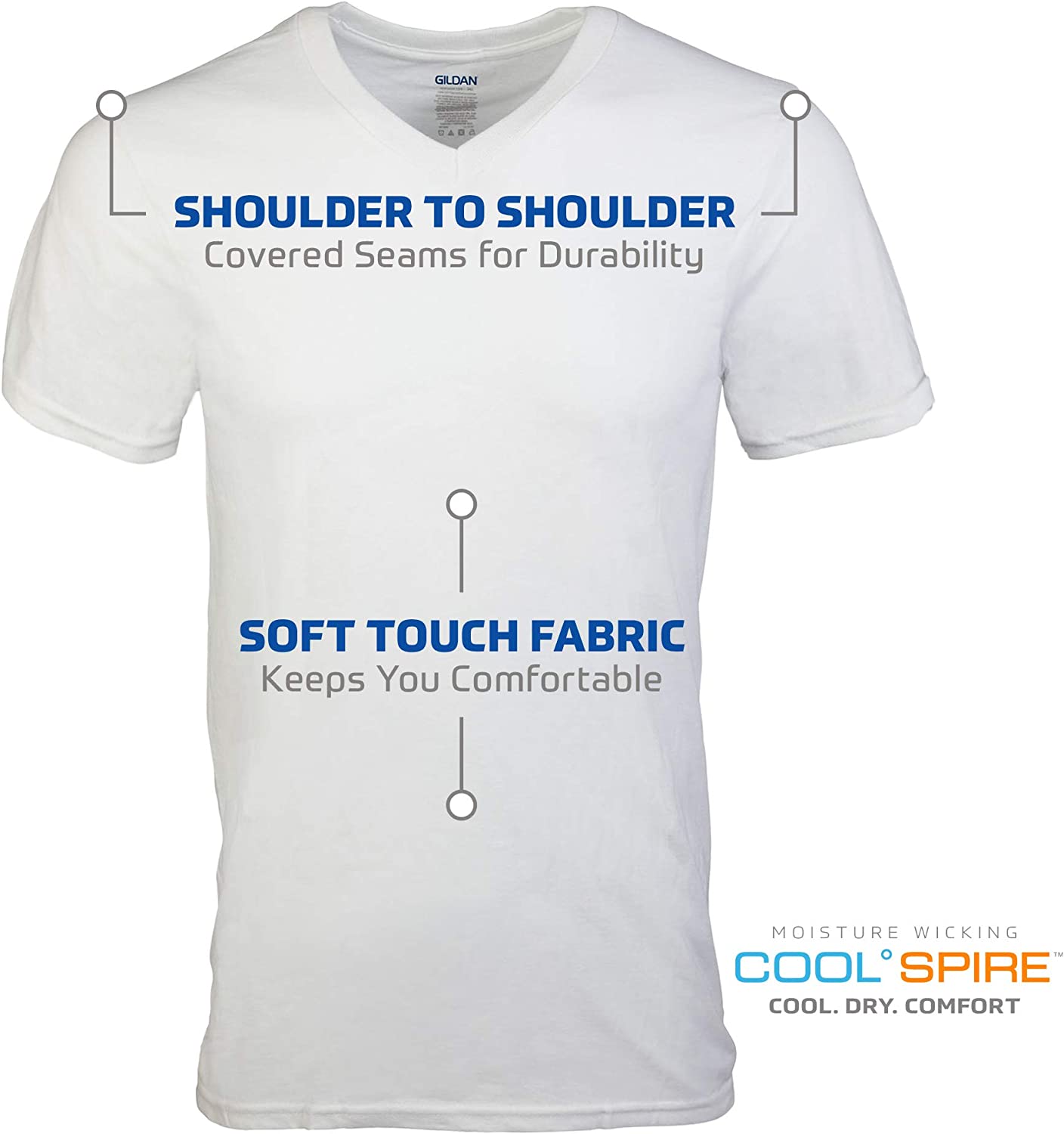 Gildan v-neck t-shirts are the ultimate in comfort. Cool Spire moisture wicking keep you cool and dry while the soft touch yarn and tag-free neck feels great all day long. These tees are built to last with durable tubular collar design and covered shoulder seams. The Gildan t-shirt will soon be your favorite...if it isn't already.
