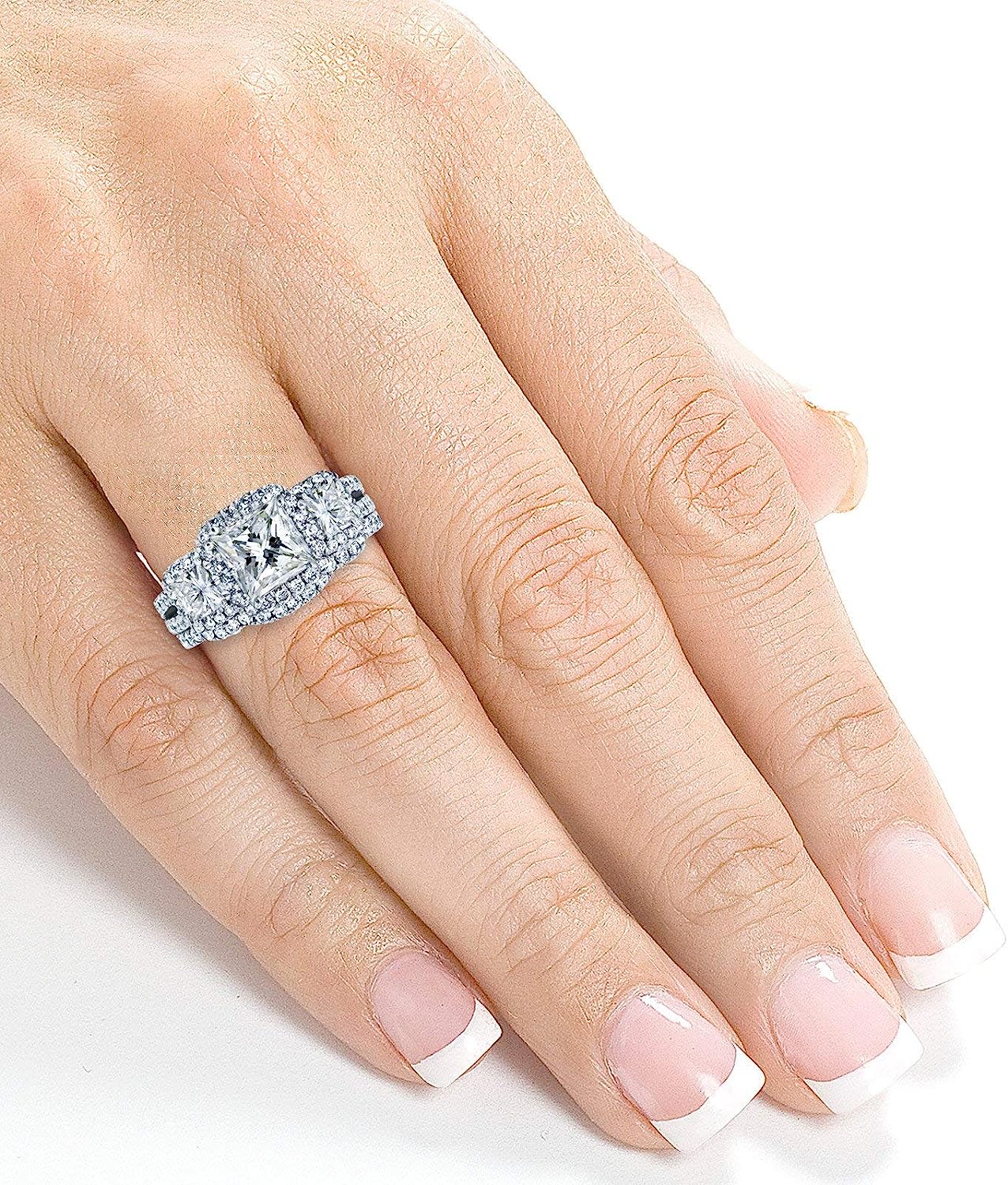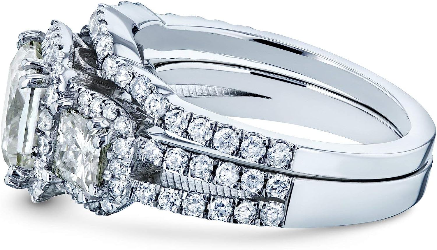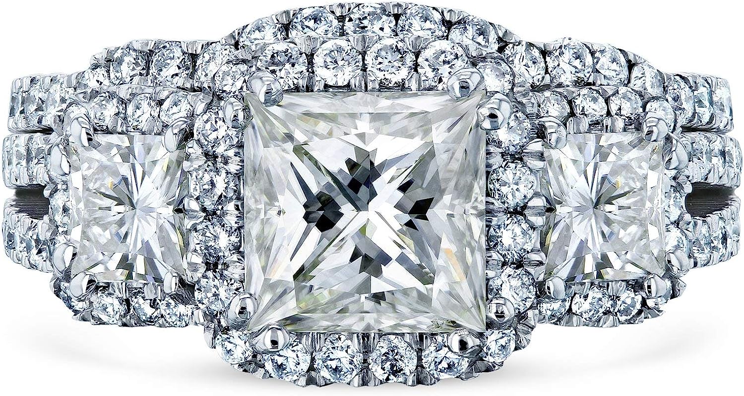 Kobelli Princess Moissanite Halo 3-Stone Bridal Rings Set 3 1/10 CTW 14k White Gold