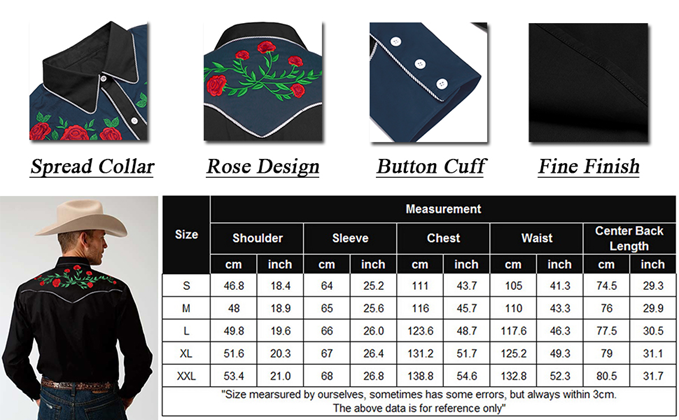 • Western Wear for men goes back more than 100 years from cattle herding to ranching where they are still worn today. Western wear has become a practical everyday wear as well as elaborate styles for country & western stars, rock bands and celebrities. This shirt is a unique collection fo mens wear, with a touch of Western Cowboy flair.And the beautiful rose floral embroidered can help you become the focus of a Club or a Party. You will never fade among the crowd.