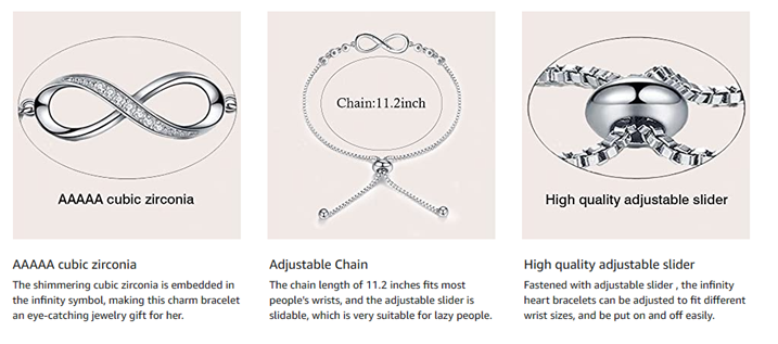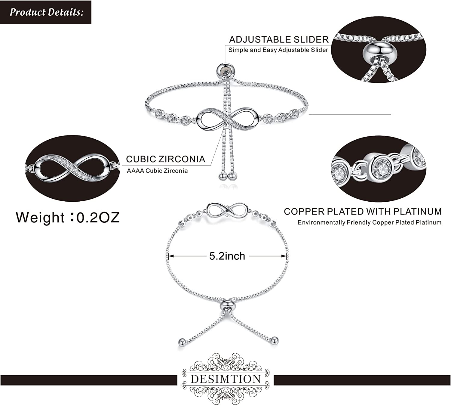 • ? Material ? The white gold plated bracelets exquisite polish technique is used here,shinning cubic zirconia is inlaid on the infinity symbol. Very Catch Eyeballs,Show you something distinguish in a special occasion, showing women's fascination