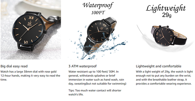A: This watch is water resistant to 3 ATM and water resistant to 100ft/ 30M(It is not recommended to wear this watch while bathing or swimming)