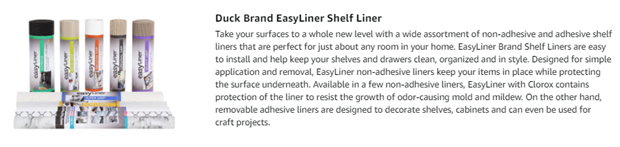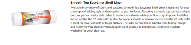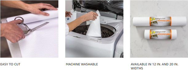 You do a lot to organize, decorate and protect your home from life's unwanted messes. Easy liner brand shelf liner does all three in a simple and affordable way. Smooth top easy liner brand shelf liner provides an easy-to-clean surface for cabinets in your kitchen, bath and laundry room. The non-adhesive grip bottom keeps the shelf liner in place and doesn’t leave a sticky residue, while the smooth top lets you easily slide objects across. With a variety of colors and trendy patterns, you can bring new life to cabinets – just cut, apply to your surface and style away.