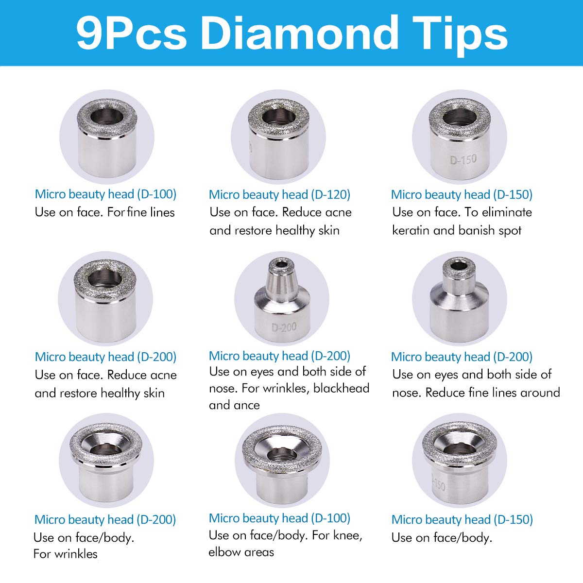 - ?【9 Diamond Head】The microdermabrasion machine is equipped with 9 shaped diamond head of different functions,it has adjustable vacuum intensity to adapt to different area treatment. It suits for face, forehead, chest, nose, neck, near eye area, and detachable bracket for convenient arrangement of diamond heads and wands. ★★Notice: Please start from the lowerest setting, then enhance vacuum bit by bit