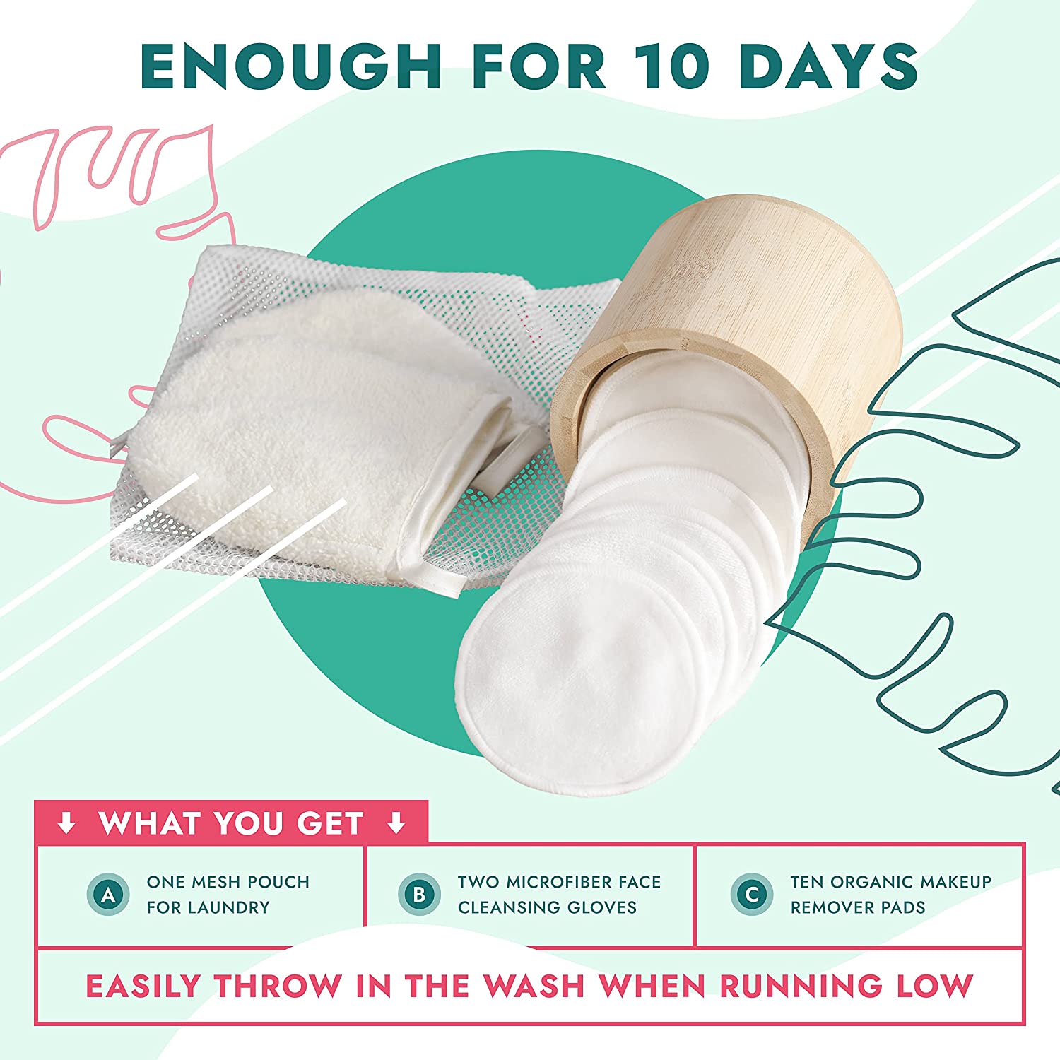 ECO-FRIENDLY & WASTE FREE: Replace your wasteful makeup wipes for good! Our organic makeup remover pads and cleansing gloves can be washed and reused hundreds of times, saving you money and reducing landfill waste. Our product replaces 10,000 disposable cotton balls! Even our packaging is plastic-free and can be recycled.