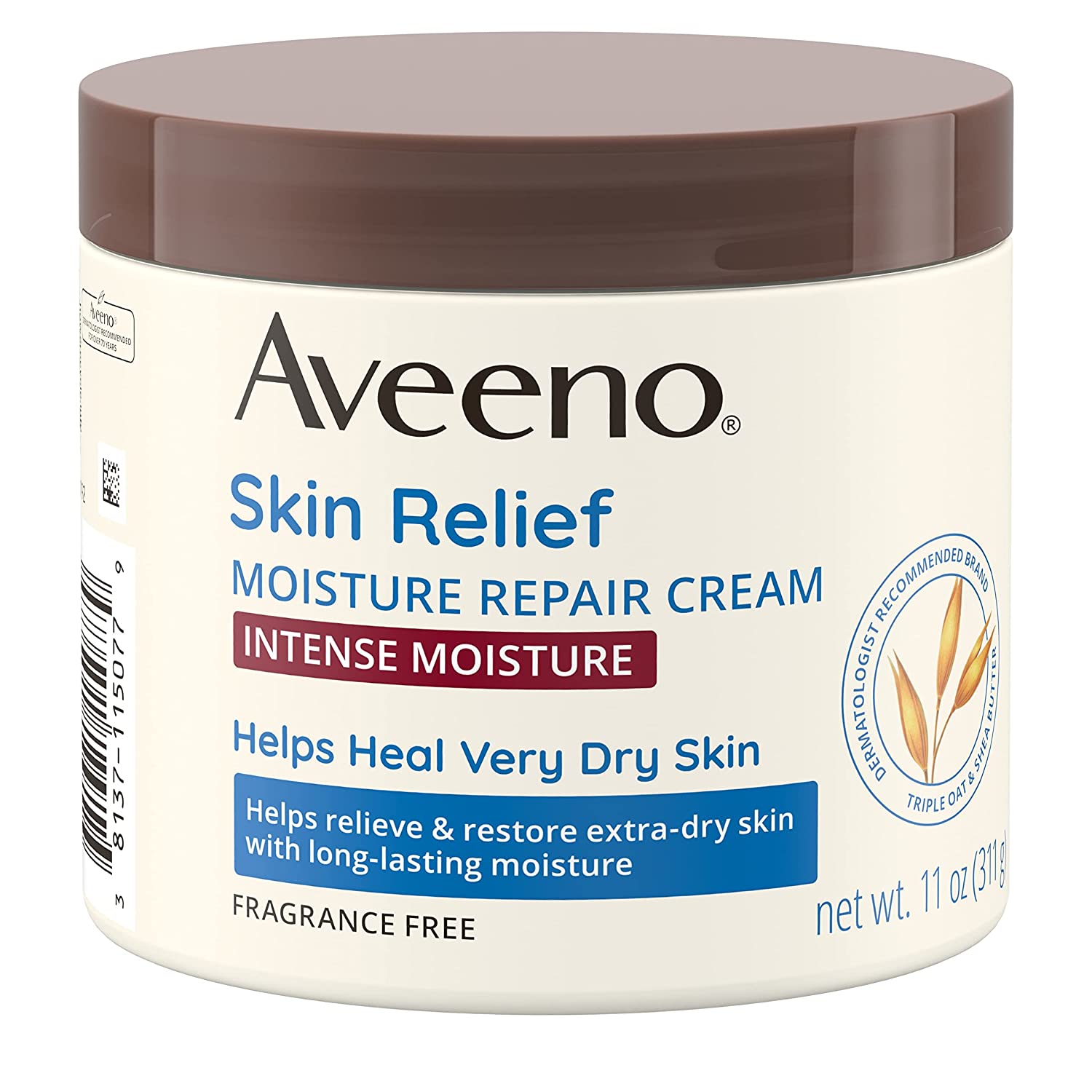 - 11-ounces of Aveeno Skin Relief Moisture Repair Body Cream with a Triple Oat and Shea Butter formula is fragrance-free and helps relieve and restore extra-dry skin with long-lasting moisture