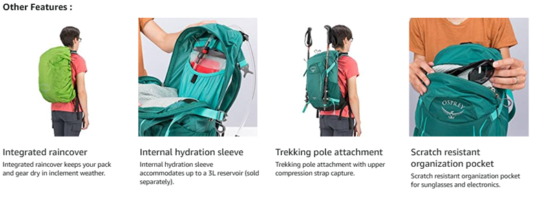 • Scratch resistant organization pocket for sunglasses and electronics.Trekking pole attachment with upper compression strap capture