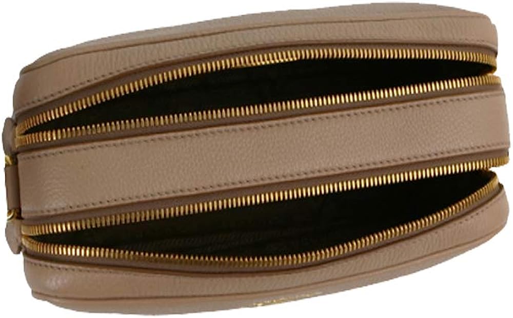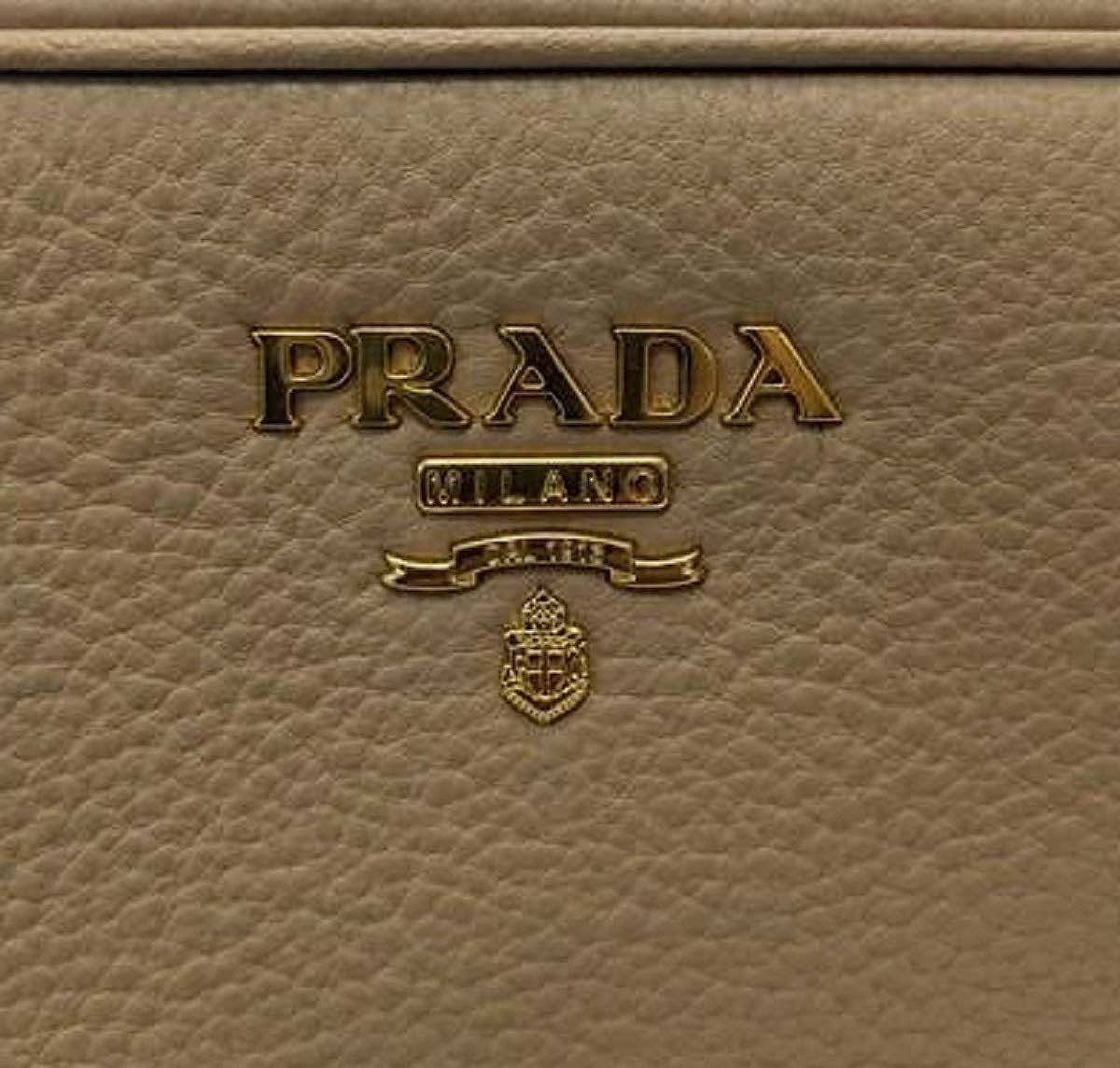 • The bag features a gold Prada Milano logo on the front and an adjustable leather strap. The two zipper compartments open to a spacious jacquard lined interior that allows for convenient storage and organization. This Prada handbag is great for everyday use with the distinctive quality and style of Prada! Model Number: 1BH079. Cammeo Beige. Vitello Phenix Grain Leather. Gold-tone Hardware. Prada Milano Logo. Zipper Fastening. Two Zipper Compartments.