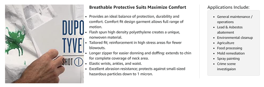 Tyvek 400 garments are composed of flash spun high density polyethylene which creates a unique, nonwoven material available only from DuPont. Tyvek 400 provides an ideal balance of protection, durability and comfort of any limited use fabric technology. Tyvek 400 fabric offers an inherent barrier against particles (down to 1.0 micron in size). Protection is built into the fabric itself; there are no films or laminates to abrade or wear away. Tyvek 400 fabric's durability advantage over microporous film fabrics delivers consistently better barrier, even after wear and abrasion. Applications include: lead and asbestos abatement/remediation, general maintenance/operations, spray painting, general clean-up.