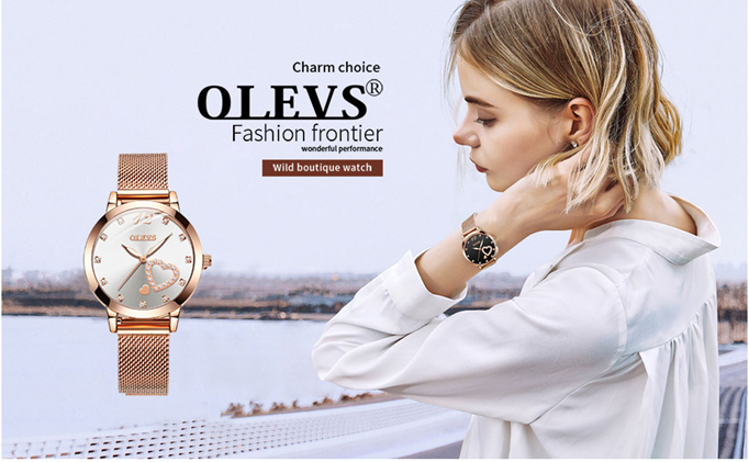 OLEVS Women's Rose Gold Watches Heart Diamond Japanese Quartz Movement Girls Ladies Wristwatch Big Face Waterproof Mesh Belt Watch and Bracelet Set Valentines Day Gifts