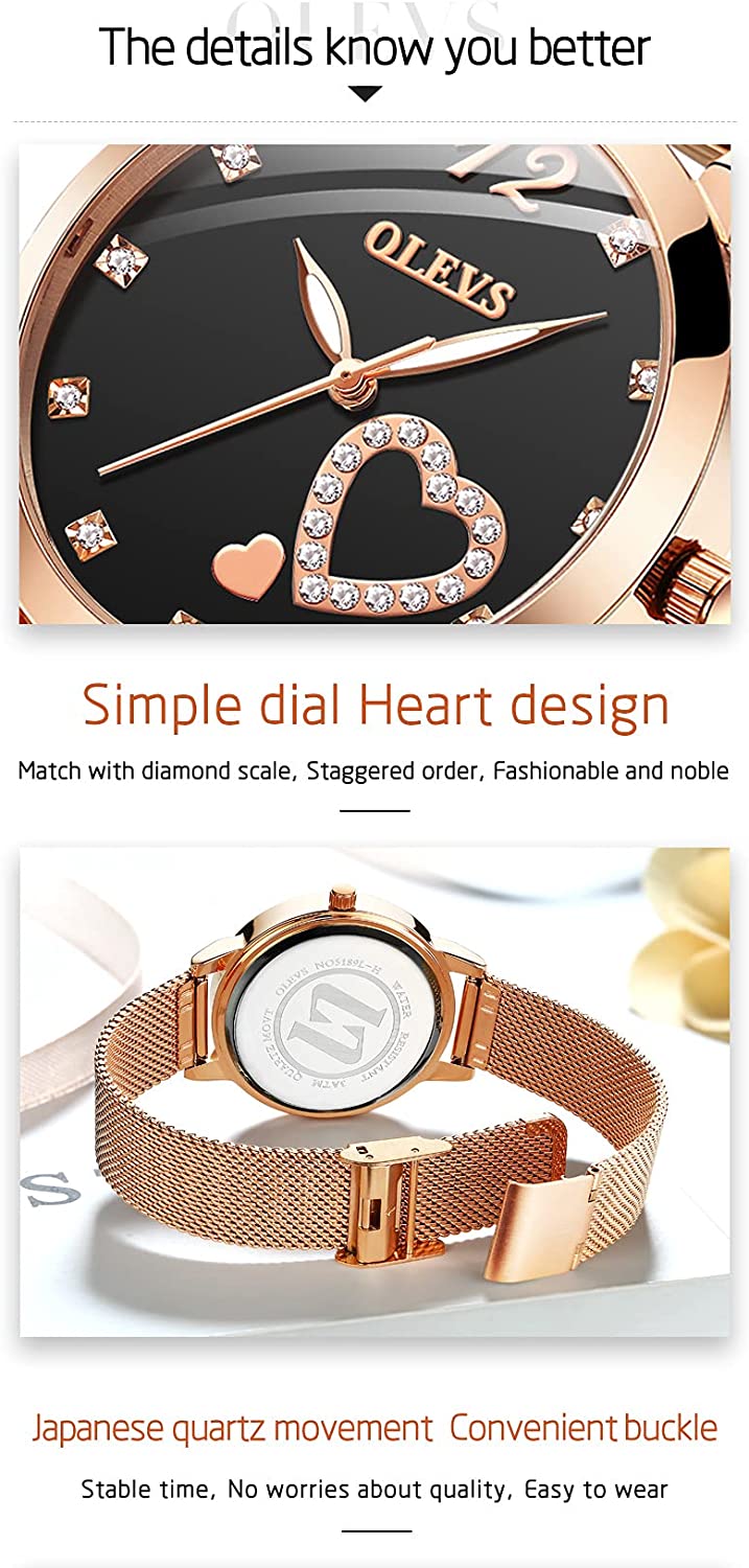 • 【CASUAL ELEGANT WATCH】Unique Heart Dial with shining diamond, slim watch hands. Quality stainless steel case and soft stainless steel mesh strap with hook buckle, elegant business watch with Japanese quartz movement which makes your time more precise. Adjustable mesh band bring your comfortable wearing experience.