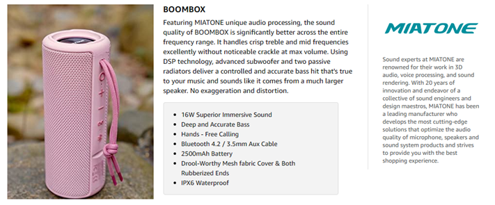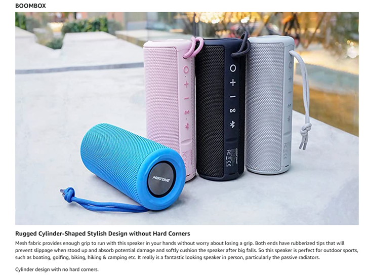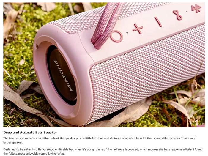 • [Immersive Sound] Featuring MIATONE unique audio processing, the sound quality of BOOMBOX bluetooth speaker is significantly better across the entire frequency range from dual precision acoustic stereo drivers. It handles crisp treble and mid frequencies excellently without noticeable crackle at max volume. Using DSP technology, dual advanced subwoofers and aluminum passive radiators on each ends boost deep and accurate bass that's true to your music. No exaggeration and distortion.