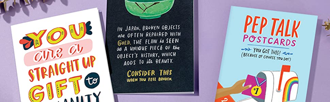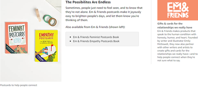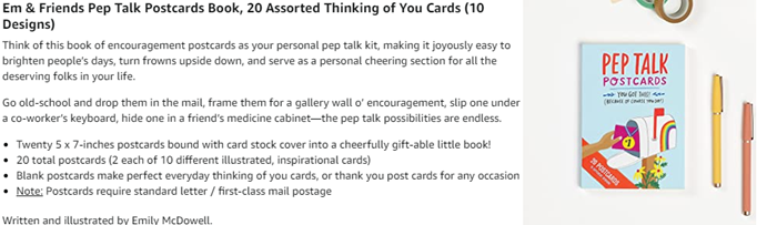IMPORTANT: Postcards require standard letter / first-class mail postage. Includes one book of twenty (20) 5 x 7-inches postcards with card stock cover 2 each of 10 different designs (20 total postcards) Think of this book as your personal pep talk kit making it joyously easy to brighten people’s days turn frowns upside down and serve as a personal cheering section for all the deserving folks in your life Go old-school and drop them in the mail frame them for a gallery wall o’ encouragement slip one under a co-worker’s keyboard hide one in a friend’s medicine cabinet—the pep talk possibilities are endless. Em & Friends makes products that speak to the human condition with honesty humor and heart. Founded by writer and illustrator Emily McDowell they now also partner with other writers and artists to create gifts and cards for the relationships we really have—and to help people connect when they're not sure what to say.